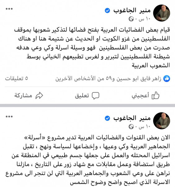وقال الجاغوب عبر صفحته بموقع (فيسبوك): “الآن بعض القنوات والفضائيات العربية، تدير مشروع (أسرلة) الجماهير العربية، وكي وعيها، وإخضاعها لسياسة ونهج، تقبل إسرائيل المحتلة، والعمل على جعلها جسماً طبيعياً في المنطقة عن طريق استضافة وعمل مقابلات مع شهاد زور على التاريخ، ومازلنا نراهن على وعي الشعوب والجماهير العربية، التي لن تنجر إلى مشروع الأسرلة، الذي أصبح واضحاً وضوح الشمس.