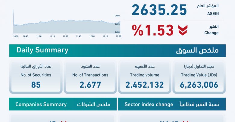 وبلغت كمية الأسهم المتداولة نحو 2.4 مليون سهم بقيمة إجمالية بلغت نحو 6.2 مليون دينار نتيجة تنفيذ 2677 صفقة.