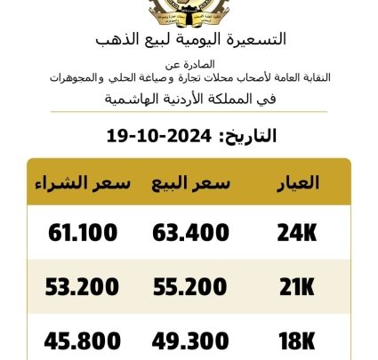 في حين بلغ سعر غرام الذهب من عيار 24، 63.4 دينارا، وغرام 18، 49.3 دينارا.