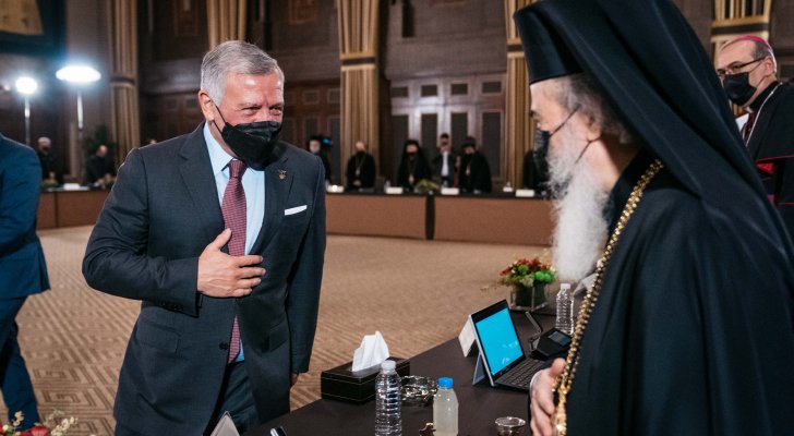 وجدد المتحدثون شكرهم على تبرع جلالة الملك الموصول لإعمار المسجد الأقصى المبارك وقبة الصخرة المشرفة، وترميم قبر السيد المسيحِ، عليه السلام، وكنيسة القيامة وكنيسة الصعود. وفي كلمة لغبطة البطريرك ثيوفيلوس الثالث، بطريرك المدينة المقدسة وسائر أعمال الأردن وفلسطين، والتي ألقاها نيافة المطران خرستوفوروس عطاالله رئيس مجلس رؤساء الكنائس في الأردن، قال إن “تاريخ المقدسات الإسلامية والمسيحية يخبرنا أن الدفاع عنها وصونها كان مهمة الرجال العظام، الذين استطاعوا الحفاظ عليها والذود عن حياضها، بدءاً من الخليفة العادل عمر بن الخطاب، مرورا بصلاح الدين الأيوبي، وصولا إليكم يا صاحب الجلالة، كوصي على مقدساتنا في القدس الشريف، وكيف لا، وقد أثبتم أنكم أهل لهذه الوصاية لما تتمتعون به من الحكمة والانفتاحِ والصمود في الحق”.