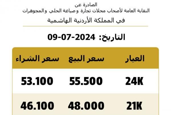 فيما بلغ سعر الغرام الواحد من الذهب عياري 24 و18 لغايات البيع من محلات الصاغة 55.50 و 42.90 دينارا على التوالي.
