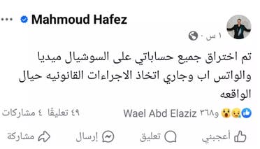وكان حافظ أوضح في منشور على فيسبوك أمس السبت اختراق حسابه الخاص على موقع التواصل الاجتماعي وكذا واتساب، وسرقة بعض الفيديوهات الخاصة به.