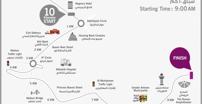 وتشمل الإغلاقات كذلك شارع عقبة بن نافع وشارع الأميرة بسمة بشكل كامل وحتى منطقة الساحة الهاشمية، وذلك من الساعة السادسة صباحاً وحتى الساعة الثانية عشرة ظهراً، ضمن مسار سباق الـ10 كم الذي ينطلق في الساعة التاسعة صباحاً.