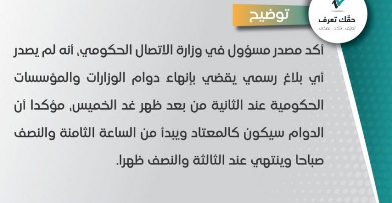 حرير- أكد مصدر مسؤول في وزارة الاتصال الحكومي، أنه لم يصدر أي بلاغ رسمي يقضي بانهاء دوام الوزارات والمؤسسات الحكومية عند الثانية من بعد ظهر غد الخميس.