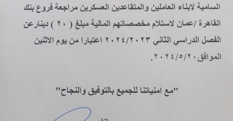 حرير- أعلن مكتب البعثات العسكرية أن على الطلبة المبعوثين على حساب نفقة المكرمة الملكية السامية لأبناء العاملين والمتقاعدين العسكريين (طلاب المكرمة الملكية السامية) مراجعة فروع بنك القاهرة/عمان لاستلام مخصصاتهم المالية البالغة (20 دينار ) عن الفصل الثاني اعتبارا من اليوم الاثنين ولغاية 4 أسابيع من تاريخ اليوم.