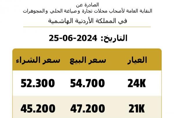 فيما بلغ سعر بيع الغرام الواحد من الذهب عياري 24 و 18 لغايات الشراء من محلات الصاغة 54.7 و 42.2 دينارا على التوالي.