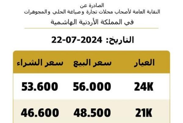 وبلغ سعر بيع غرام الذهب عيار 21 الأكثر رغبة من المواطنين في السوق المحلي 48.5 دينار لغايات الشراء من محلات الصاغة، مقابل 46.6 دينار لجهة البيع، فيما بلغ سعر بيع الغرام الواحد من الذهب عياري 24 و18 لغايات الشراء من محلات الصاغة، عند 56 دينارا و43.3 دينار على التوالي.