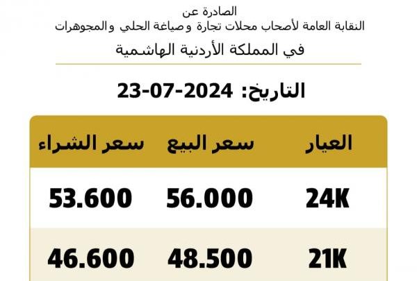 وبلغ سعر بيع غرام الذهب عيار 21 الأكثر رغبة من المواطنين في السوق المحلي 48.5 دينارا لغايات الشراء من محلات الصاغة، مقابل 46.6 دينارا لجهة البيع، فيما بلغ سعر بيع الغرام الواحد من الذهب عياري 24 و18 لغايات الشراء من محلات الصاغة، عند 56 دينارا و43.3 دينارا على التوالي.