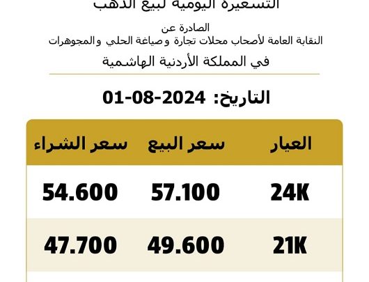 ووفقًا للتسعيرة، ارتفع سعر بيع الغرام من عيار 21 في محلات الصاغة إلى 49.60 دينار، بينما بلغ سعر الشراء 47.70 دينار.