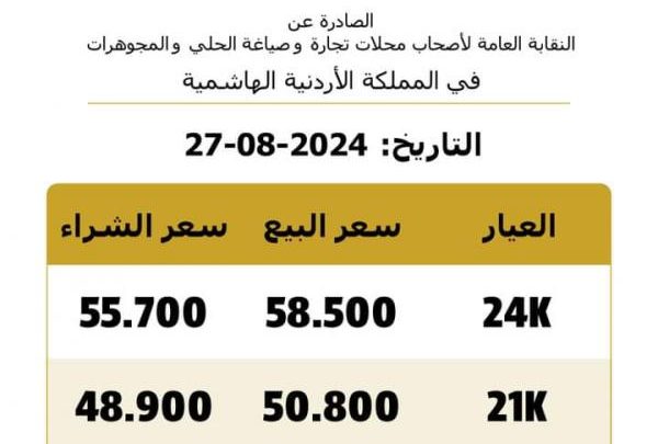 وبلغ سعر بيع غرام الذهب عيار 21 الاكثر طلبا لدى المواطنين 50.80 دينارا لغايات الشراء من محال الصاغة، مقابل 48.90 دينارا لجهة البيع.