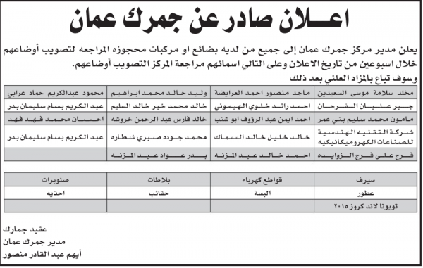 حرير- أعلن مركز جمرك عمان عن أسماء ممن لديهم بضائع ومركبات محجوزة لدى المركز، ضرورة مراجعة المركز لتصويب أوضاعهم.