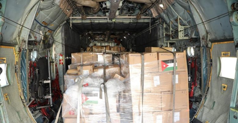 وتحمل الطائرة التي أرسلتها القوات المسلحة الأردنية بالتنسيق مع الهيئة الخيرية الأردنية الهاشمية مواداً غذائية وطبية وإغاثية.