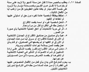 ونصت المادة 61 في قانون الانتخاب (النافذ حاليا)، على أنه يعاقب بالحبس مدة لا تقل عن 6 أشهر ولا تزيد على سنة، أو بغرامة مالية لا تقل عن 2500 دينار ولا تزيد على 5 آلاف دينار أو بكلتا هاتين العقوبتين كل من ارتكب الأفعال التالية: