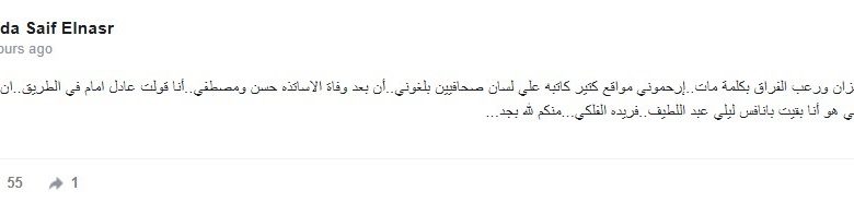 وكتبت فريدة: “وبجد في عز الأحزان ورعب الفراق بكلمة مات.. ارحموني، مواقع كتير كاتبة على لسان صحافيين بلغوني أن بعد وفاة الأساتذة حسن ومصطفى، أنا قلت عادل إمام في الطريق”، ساخرة من ردود الأفعال والشائعات المنسوبة إليها، قائلة: “ليه يعني هو أنا بقيت أنافس ليلى عبداللطيف.. فريدة الفلكي.. منكم لله بجد”.