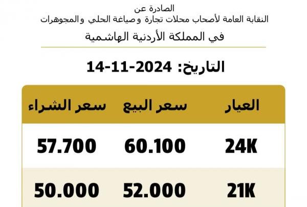 وبلغ سعر بيع غرام الذهب “عيار 21” في السوق المحلية، عند 52 دينارا ، مقابل 50 دينارا لجهة الشراء.