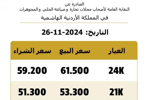 ووصل سعر غرام الذهب عيار 21 إلى 53.30 دينارًا لجهة البيع مقابل 51.30 لجهة الشراء.