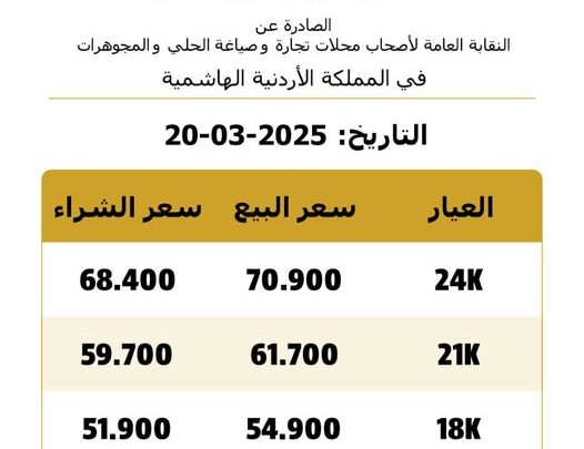 وحسب النشرة اليومية التي أصدرتها النقابة العامة لأصحاب محلات تجارة وصياغة الحلي والمجوهرات، بلغ سعر الغرام الواحد من الذهب عيارات 24 و18 و 14 لغايات البيع من محلات الصاغة عند 70.90 و 54.90 و 41.60 دينار على التوالي.