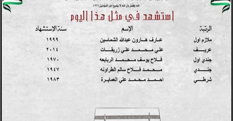 1. الملازم أول عارف هارون عبدالله الشماسين – استشهد عام 1999.