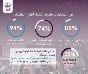 وطالب ٨٨ % من الطلبة بتأخير بداية المحاضرات الصباحية في فصل الشتاء ، ولاحظ ٧٤ % منهم تجمعات مائية في كلياتهم مع هطول الأمطار ، وذلك في استطلاع للرأي أجرته قائمة أهل الهمة بين طلبة الجامعة الأردنية مؤخرا.