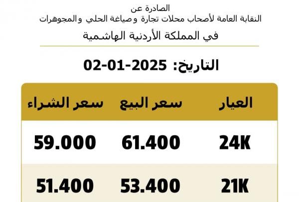 وبحسب تسعيرة نقابة الحلي والمجوهرات، بلغ سعر غرام الذهب من عيار 21 نحو 53.4 دينارا لغايات الشراء و 51.4 لغايات البيع.