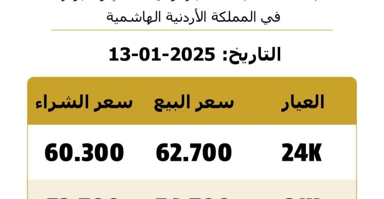 وبحسب التسعيرة اليومية الصادرة عن النقابة العامة لأصحاب محال تجارة الحلي والمجوهرات، استقر أيضا سعر بيع الغرام الواحد من الذهب عياري 24 و18 لغايات البيع من محال الصاغة، عند 62.70 دينارا و48.70 دينارا على التوالي.