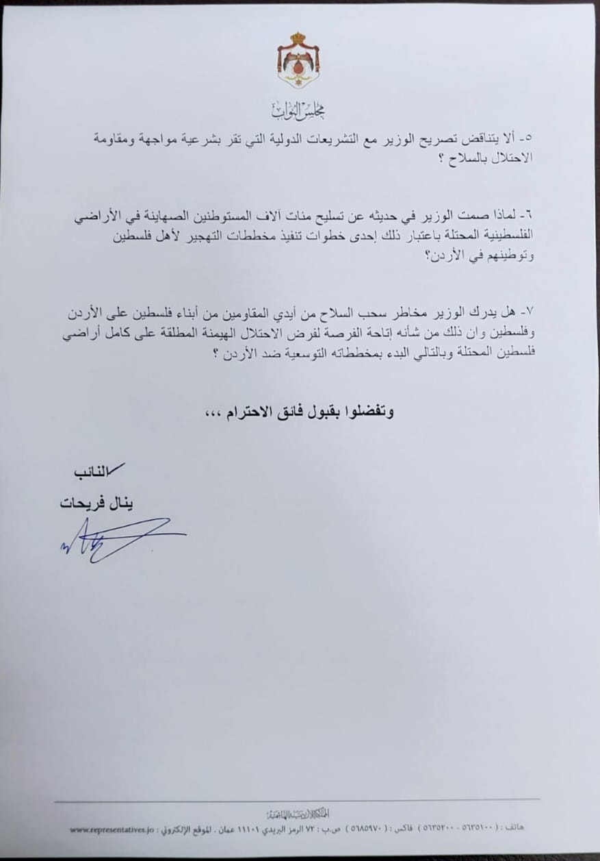 وختم بالسؤال إن كان الوزير يدرك مخاطر سحب السلاح من أيدي المقاومين بما يتيح الفرصة للإحتلال للهيمنة المطلقة على كامل أراضي فلسطين والبدء بمخططاته التوسعية ضد الأردن.