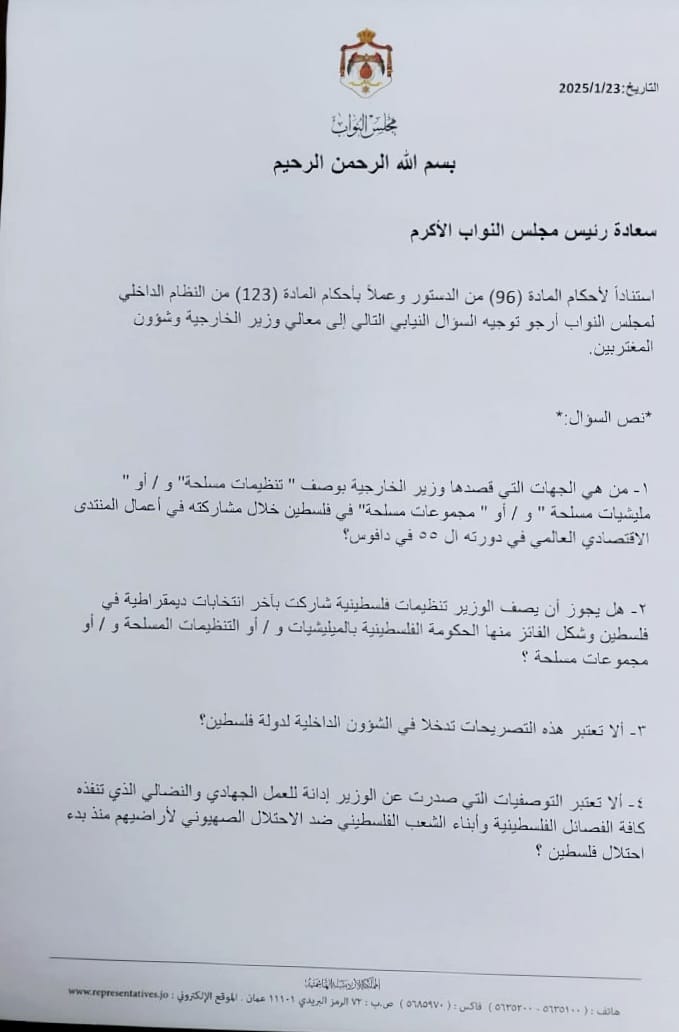 وجه النائب ينال فريحات سؤالاً لوزير الخارجية أيمن الصفدي حول تصريحاته التي أدلى بها خلال مشاركته بالمنتدى الاقتصادي العالمي في دافوس، فيما يتعلق بضرورة عدم وجود ميليشيات مسلحة في غزة.
