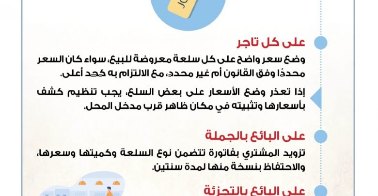 وأشارت إلى أنه على البائع بالجملة تزويد المشتري بفاتورة تتضمن نوع السلعة وكميتها وسعرها والاحتفاظ بنسخة منها لمدة سنتين وعلى البائع بالتجزئة تزويد المشتري بفاتورة إذا طلب ذلك.