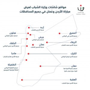 حرير – بتوجيه من صاحب السمو الملكي الأمير الحسين بن عبدالله الثاني ولي العهد المعظم، تقوم وزارة الشباب بعرض مباراة الأردن وعمُان يوم الخميس من خلال شاشات عرض في المدن الرياضية والمرافق / المديريات / المنشآت التابعة للوزارة، في محافظات المملكة كافة.