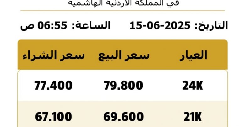 حرير- استقرت أسعار الذهب في السوق المحلية الأردنية، اليوم الأحد، بحسب النشرة اليومية الصادرة عن النقابة العامة لأصحاب محلات تجارة وصياغة الحلي والمجوهرات.