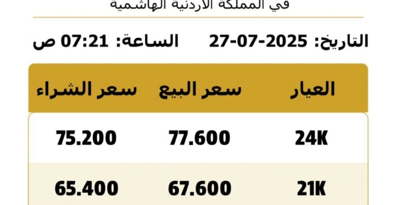 وبلغ سعر بيع غرام الذهب من عيار 21 نحو 67.60 دينارا لغايات البيع لدى محالّ الصاغة، مقابل 65.40 دينارا لغايات الشراء.