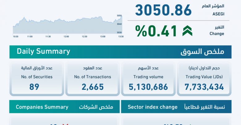 وارتفع الرقم القياسي العام لأسعار الأسهم لإغلاق هذا اليوم إلى 3050 نقطة، بارتفاع نسبته 0.41 بالمئة، إذ ارتفع الرقم القياسي في القطاع المالي بنسبة 0.58 بالمئة، وفي قطاع الصناعة بنسبة 0.41 بالمئة، بينما انخفض الرقم القياسي في قطاع الخدمات بنسبة 0.03 بالمئة.