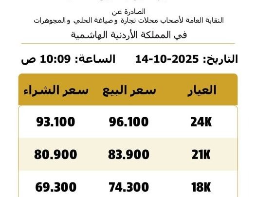 ووفقا للنشرة اليومية الصادرة عن النقابة العامة لأصحاب محلات تجارة وصياغة الحلي والمجوهرات، ارتفع سعر الغرام الواحد من الذهب لعيارات 24 و18 و14 إلى 96.1 دينارا و74.3 دينارا و56.5 دينارا على التوالي، لغايات البيع من محلات الصياغة.