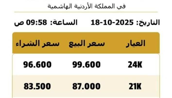 وبلغ سعر بيع غرام الذهب عيار 21، الأكثر تداولا بين المواطنين، 87.0 دينارا لغايات البيع، مقابل 83.5 دينارا لغايات الشراء.
