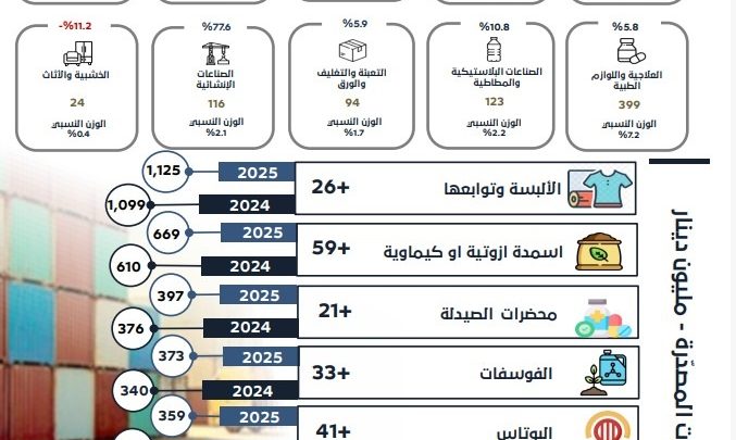 يذكر أن الصادرات الوطنية بلغت منذ بداية العام الحالي وحتى نهاية آب الماضي 6.098 مليار دينار، بنسبة نمو 8 بالمئة، مقارنة مع الفترة نفسها من 2024.