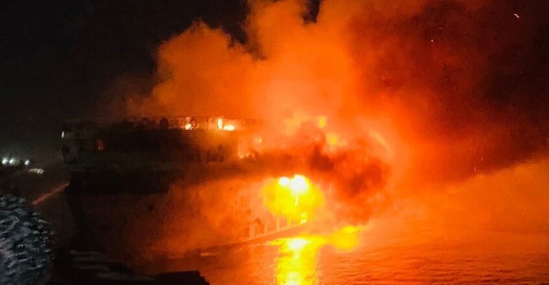 وتداول رواد مواقع التواصل الاجتماعي صورا وفيديوهات تظهر تصاعد ألسنة اللهب وأعمدة الدخان بكثافة من الباخرة.