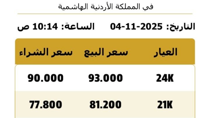 وبلغ سعر بيع غرام الذهب عيار 21 الأكثر تداولًا بين الأردنيين، 81.200 دينار للغرام، مقابل 77.800 دينار للشراء.
