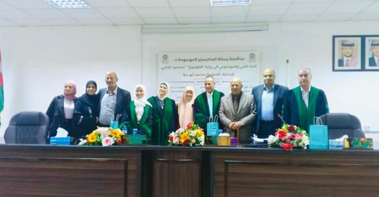 حرير – نُوقشت في كلية الآداب قسم اللغة العربية وآدابها فِي جامعة جرش رسالة الماجستير المقدّمة من الباحثة فاطمة محمد أبو دية بعنوان “البناء الفني والموضوعي في رواية “الطرموخ” لمحمود الرجبي”.