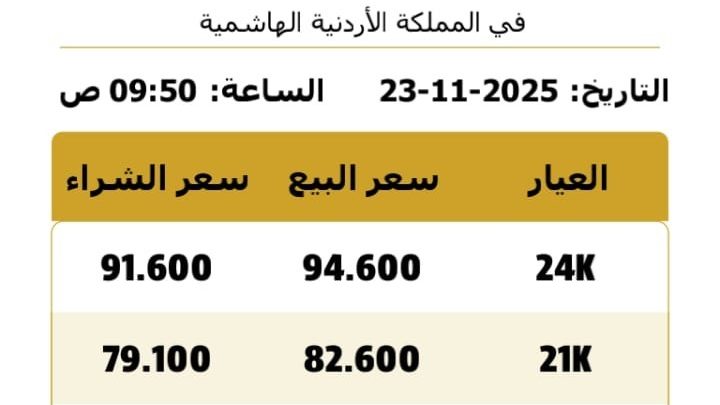 أما أسعار بيع الذهب للعيارات الأخرى، فقد سجل سعر غرام عيار (24) في محال الصاغة 94.60 دينارا، في حين بلغ سعر بيع غرام الذهب من عيار (18) 73.10 دينارا، وعيار (14) بلغ سعره 56.10 دينارا.