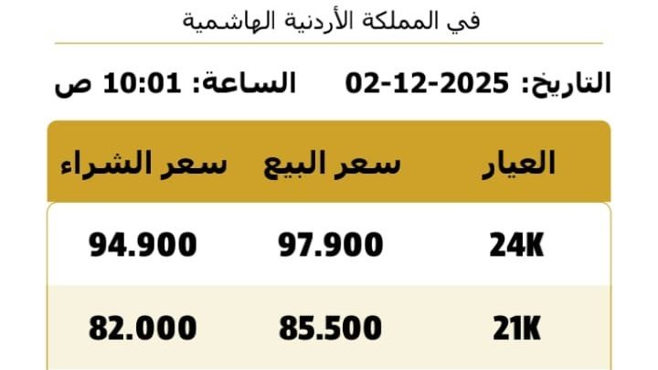 وبلغ سعر بيع غرام الذهب عيار (21) 85.50 دينارا، والشراء 82 دينارا، وفق تسعيرة النقابة العامة لأصحاب محال تجارة وصياغة الحلي والمجوهرات.