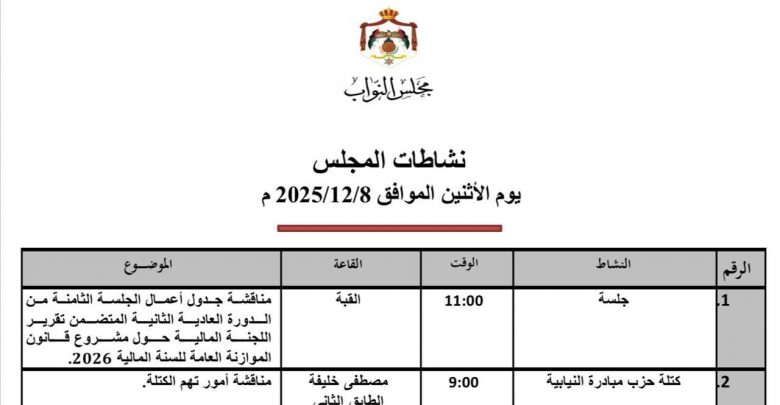 وكانت اللجنة المالية النيابية برئاسة نمر السليحات أقرّت، الأحد، مشروع قانون الموازنة العامة للسنة المالية 2026، وذلك بعد اختتام مناقشاتها التي امتدت على مدار 104 اجتماعات منذ 25 تشرين الثاني وحتى 7 كانون الأول، وشملت جميع الوزارات والدوائر والوحدات الحكومية المدرجة في الموازنة.