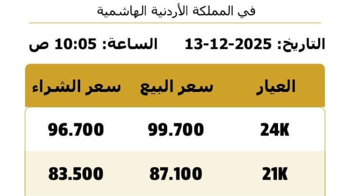 كما بلغ سعر غرام الذهب من عيارات 24 و18 و14 لغايات البيع في محال الصاغة 99.7 و77.2 و58.6 دينارا على التوالي.