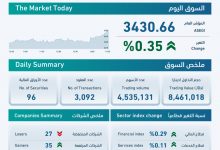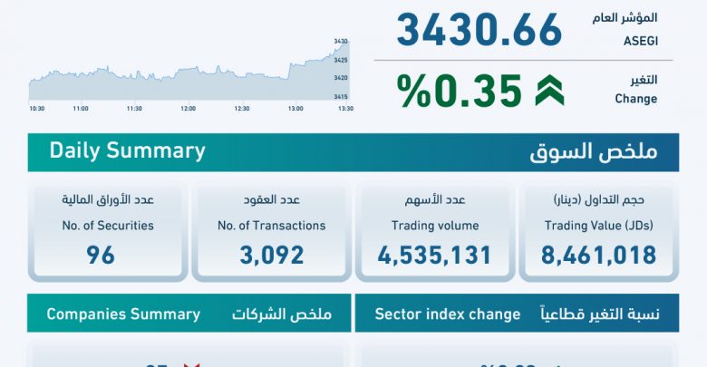 وارتفع الرقم القياسي العام لأسعار الأسهم لإغلاق هذا اليوم إلى 3430 نقطة، بارتفاع نسبته 0.35 بالمئة، إذ ارتفع الرقم القياسي في قطاع الصناعة بنسبة 0.57 بالمئة، وفي القطاع المالي بنسبة 0.29 بالمئة، وفي قطاع الخدمات بنسبة 0.11 بالمئة.