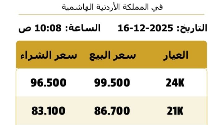 وبلغ سعر بيع الغرام الواحد من الذهب لعيارات 24 و18 و14 لغايات الشراء من محالّ الصاغة 99.50 دينارًا و77.00 دينارًا و58.70 دينارًا على الترتيب.