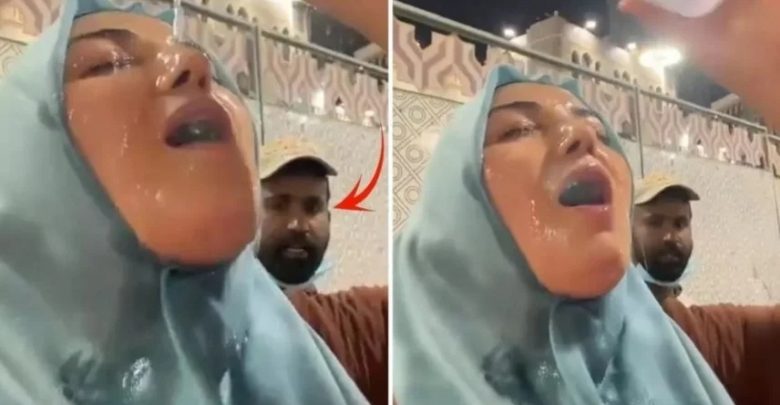 حرير- تداول مستخدمو منصات التواصل الاجتماعي مقطع فيديو يظهر سيدة أثناء أداء مناسك العمرة وهي تصب ماء زمزم على وجهها، بينما كانت تسجل اللحظة بهاتفها المحمول ونشرتها على حسابها الشخصي على تطبيق تيك توك.