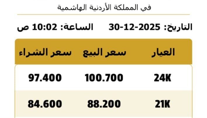 وحسب النشرة الصباحية التي أصدرتها النقابة العامة لأصحاب محلات تجارة وصياغة الحلي والمجوهرات، بلغ سعر الغرام الواحد من الذهب عيارات 24 و18 و 14 لغايات البيع من محلات الصاغة عند 100.70 و 79 و 60.20 دينار على التوالي.