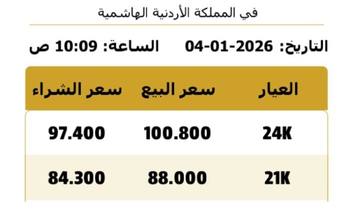 وبلغ سعر الغرام الواحد من الذهب عيارات 24 و18 و 14 لغايات البيع من محلات الصاغة عند 100.80 و 78.50 و 60.60 دينارا على التوالي.