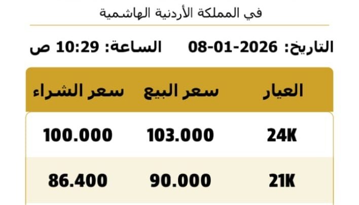 وبلغ سعر بيع غرام الذهب عيار 21، الأكثر رغبة من المواطنين في السوق المحلية، 90.00 دينارًا لغايات البيع من محلات الصاغة، مقابل 86.40 دينارًا لجهة الشراء.
