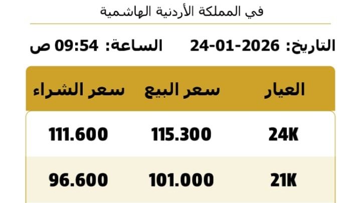 وبلغ سعر بيع غرام الذهب عيار 21 في السوق المحلي 101.00 دينارا لغايات البيع من محلات الصاغة، مقابل 96.60 دينارا للشراء.