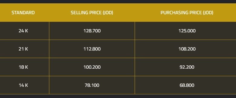 وبيّنت النقابة أن أسعار بيع الذهب سجّلت ارتفاعًا على مختلف العيارات، حيث بلغ سعر غرام الذهب عيار 24 نحو 128.7 دينارًا، فيما وصل سعر غرام عيار 21 إلى 112.8 دينارًا، وعيار 18 إلى 100.2 دينار، وعيار 14 إلى 78.1 دينار.
